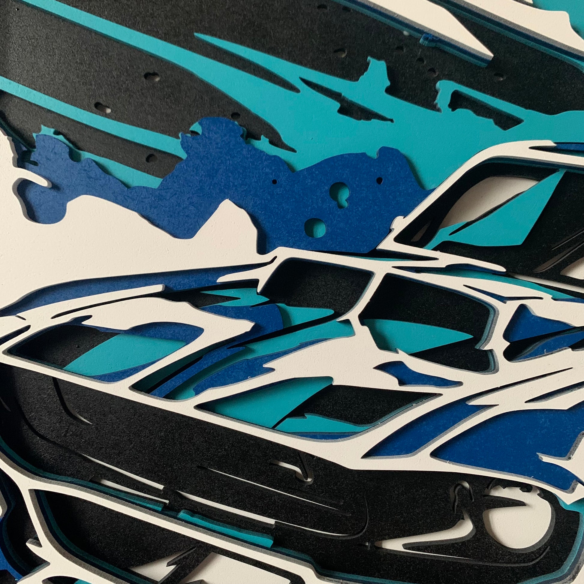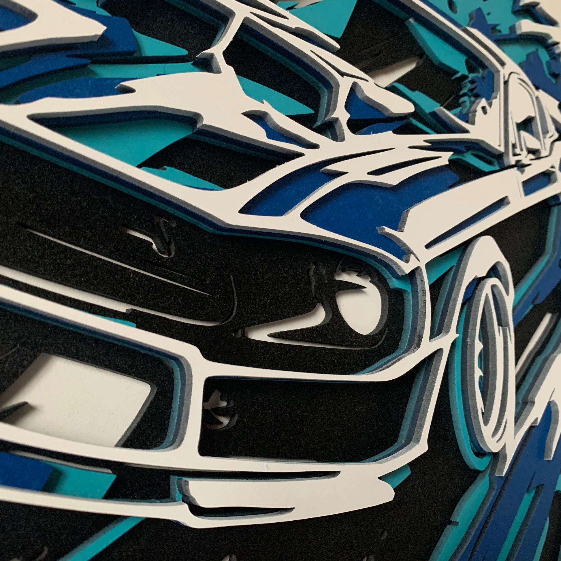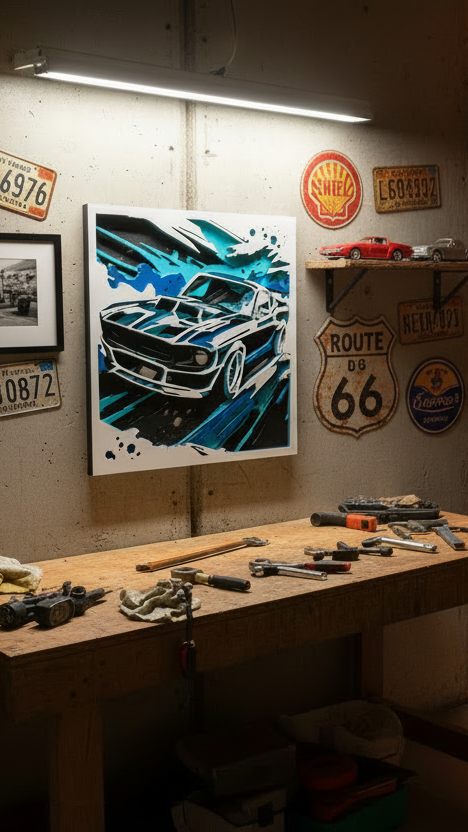 Tento obraz z více vrstev laserově řezané překližky zobrazuje dynamickou ilustraci klasického amerického muscle caru v pohybu. Kombinace kontrastních barev – černé, bílé a odstínů modré – vytváří energický a moderní efekt. Precizně vyřezané vrstvy dodávají dílu hloubku, 3D strukturu a pocit rychlosti, který umocňují ostré linie a stylizované šplíchance kolem vozu. Obraz působí jako dokonalé spojení technické přesnosti a umělecké expresivity.