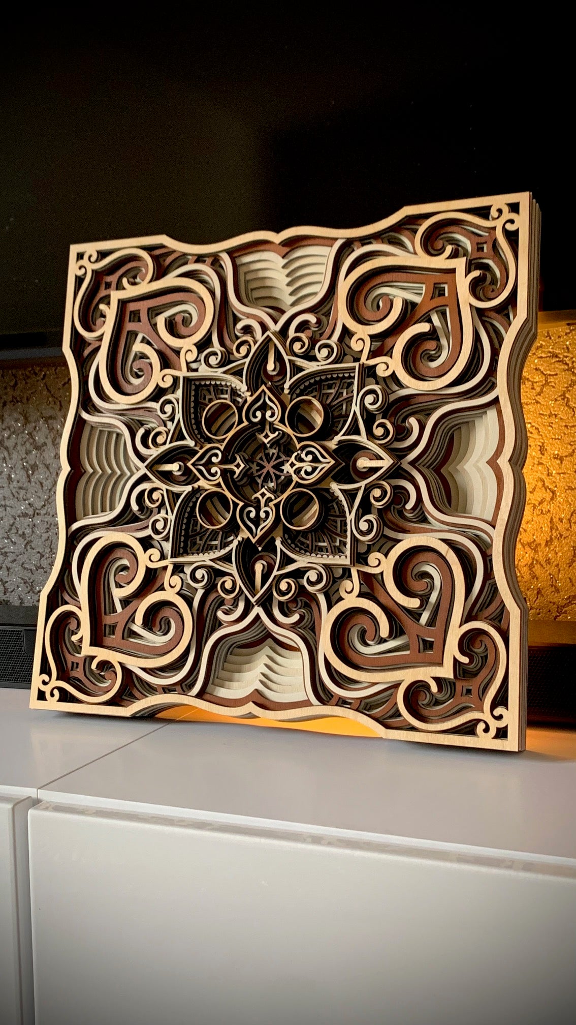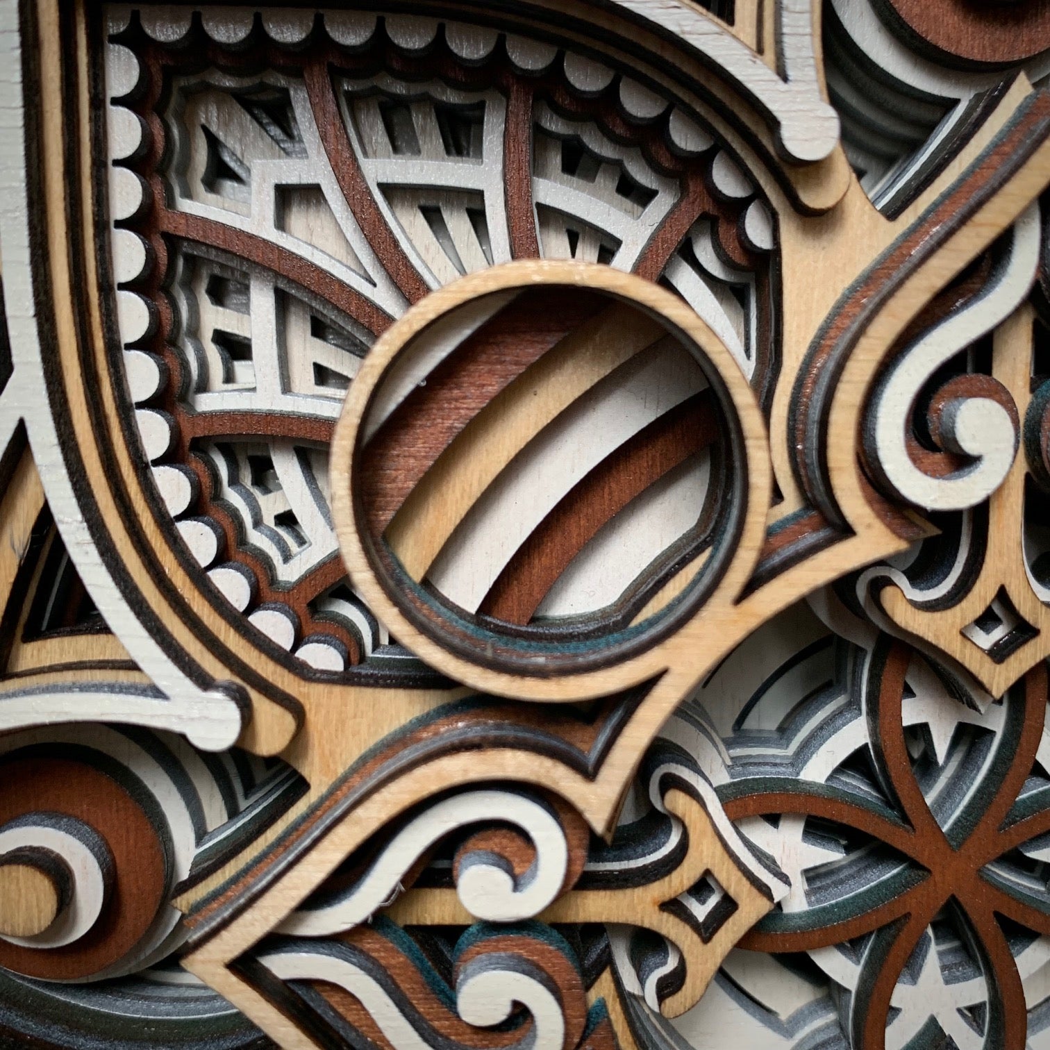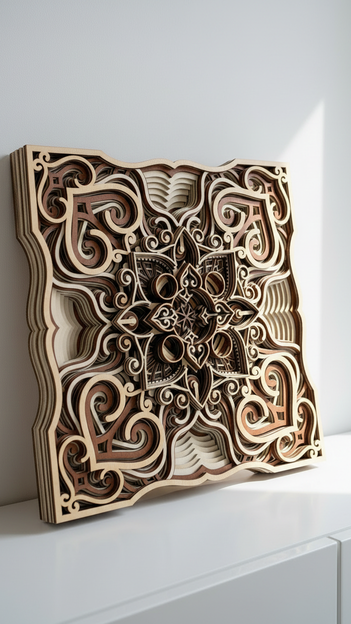 Tento obraz z laserově řezané překližky představuje nádherně propracované geometrické a ornamentální motivy, které se vrství do prostorového reliéfu. Středová mandala s jemnými detaily vytváří dojem hloubky a harmonie, zatímco kombinace přírodních odstínů dřeva – od světlé břízy po tmavší ořech – dodává dílu teplý a elegantní vzhled. Precizní zpracování a symetrická kompozice z něj činí originální umělecký kus, který spojuje moderní technologii s tradiční estetikou ruční práce.