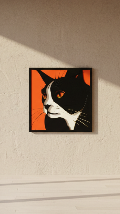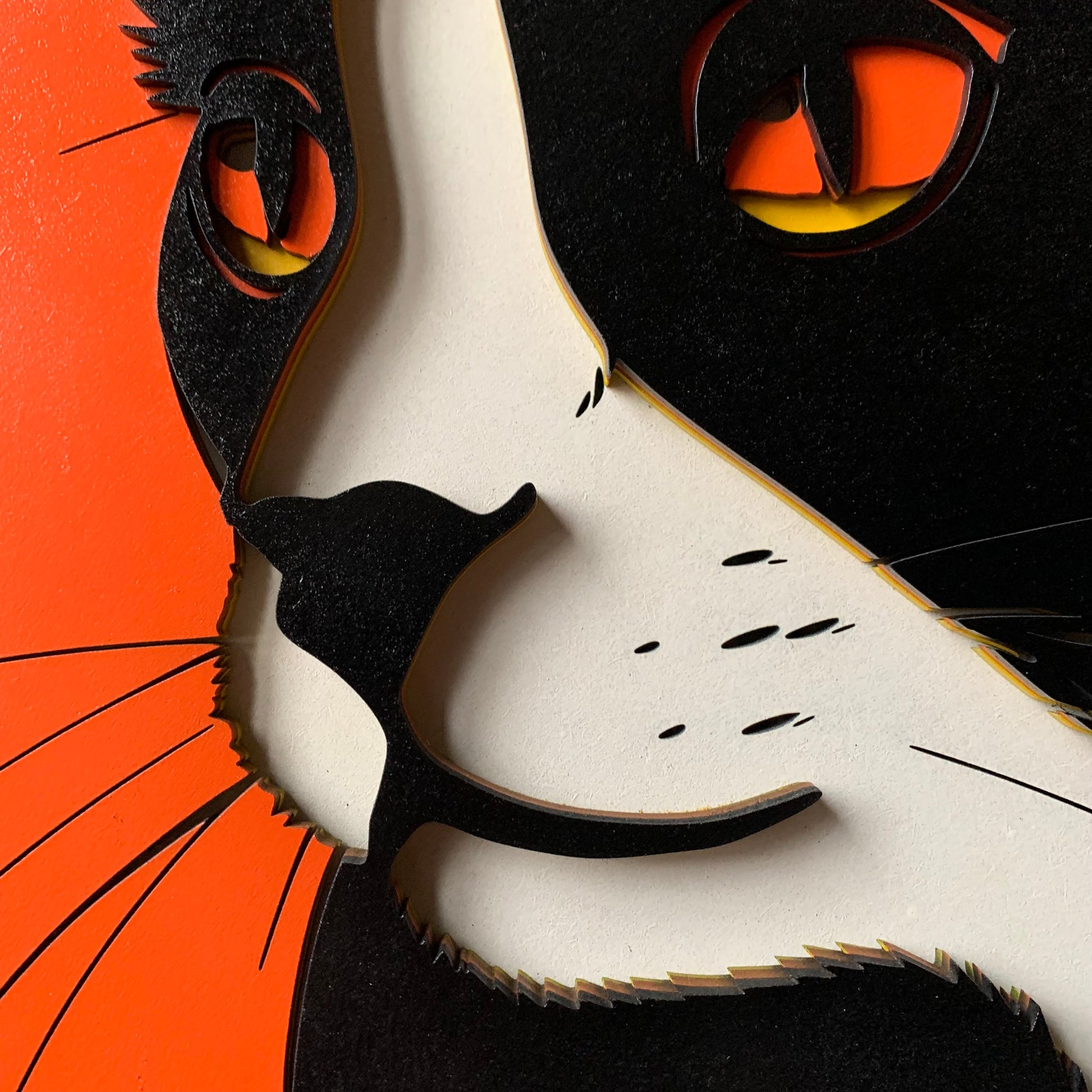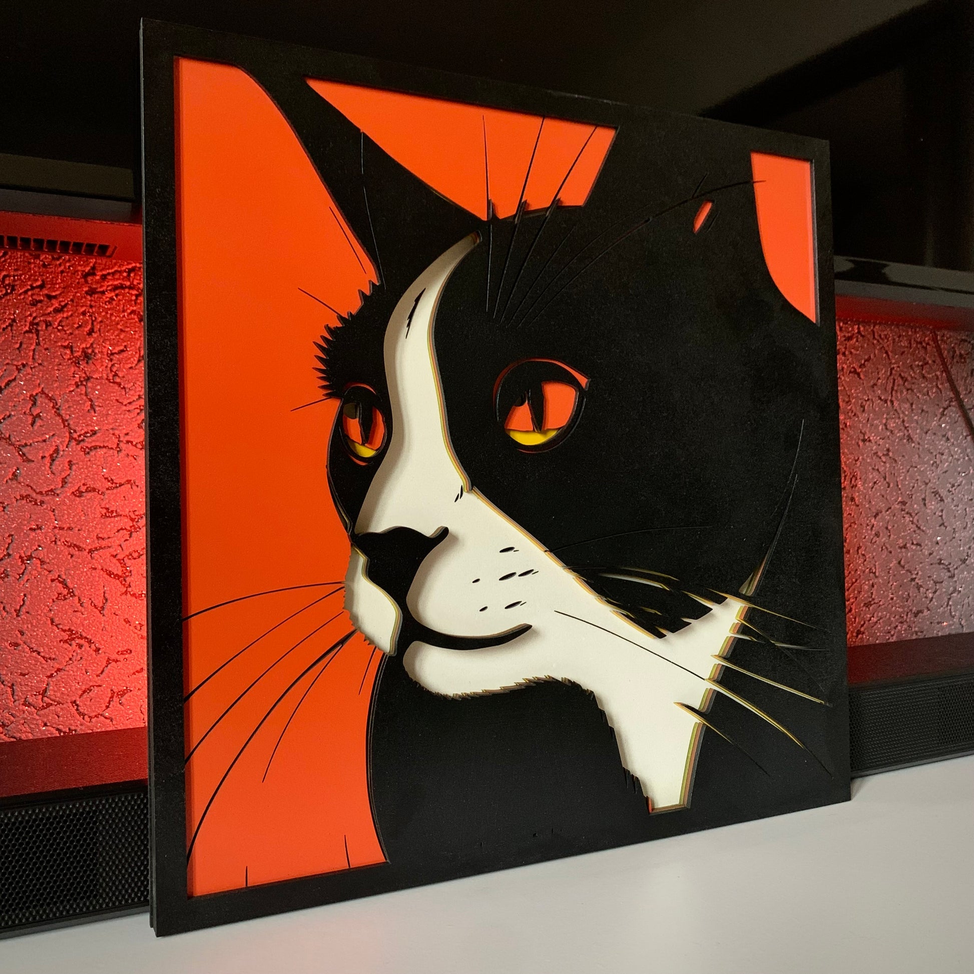 Tento jedinečný obraz kočky je vytvořen z několika precizně vyřezaných vrstev pomocí laseru. Kombinace kontrastních barev a propracovaných detailů dodává dekoraci moderní a výrazný vzhled. Ideální jako stylový doplněk do interiéru nebo originální dárek pro milovníky koček a moderního designu..